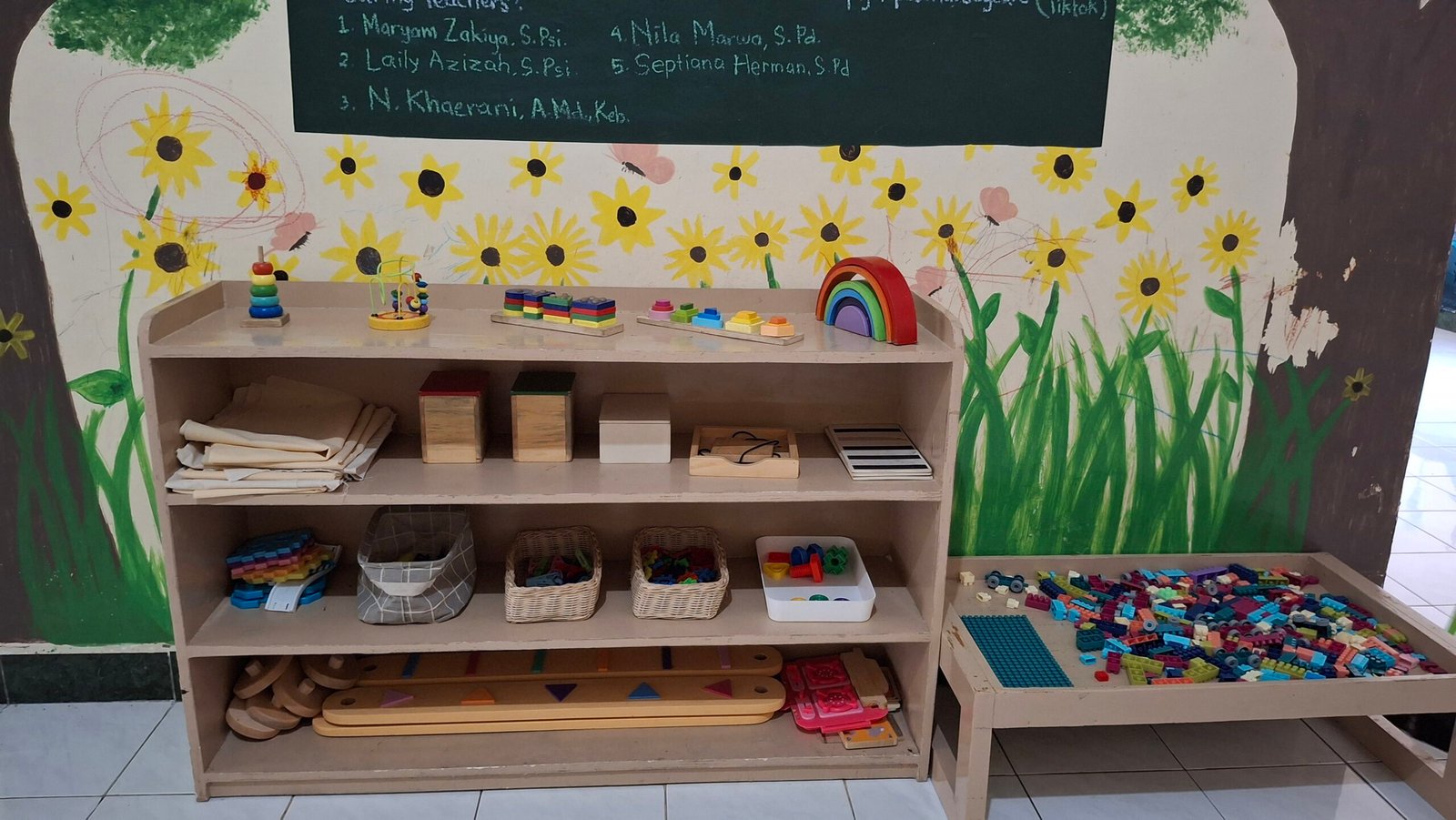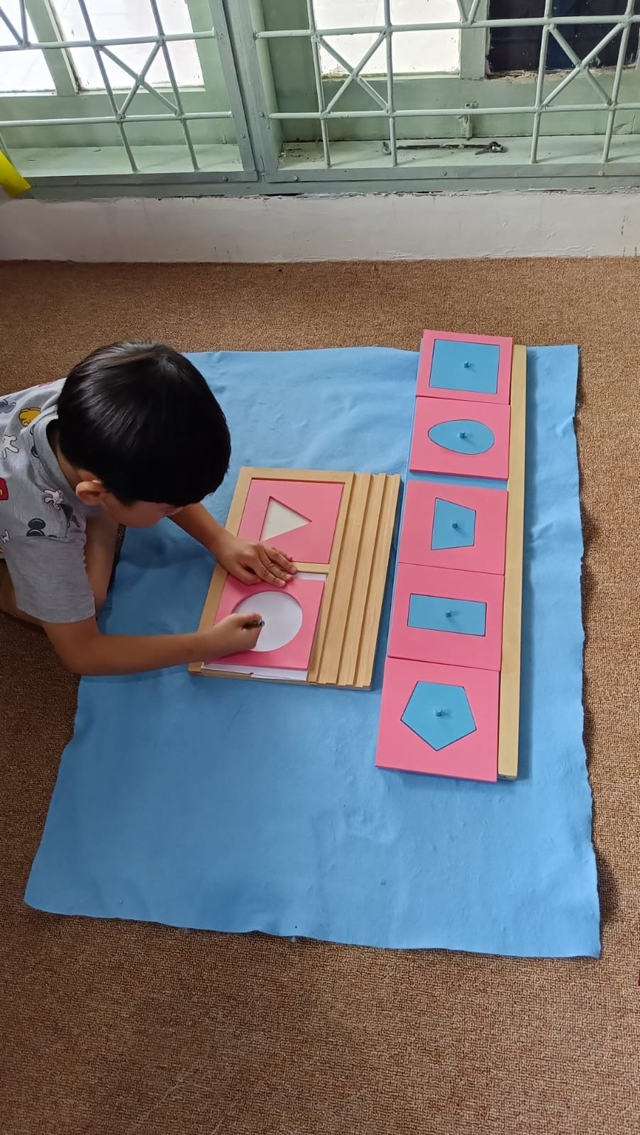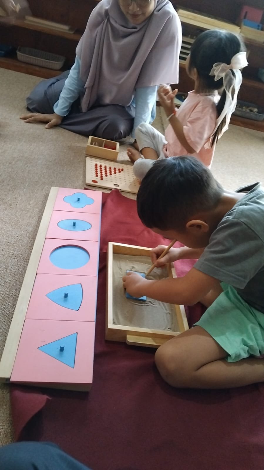 Area sensorial ini merupakan area bermain yang menggunakan material Montessori untuk menstimulasi panca indra anak seperti balok, color box, papan testur, sound boxes, baric tablets, dsb.
